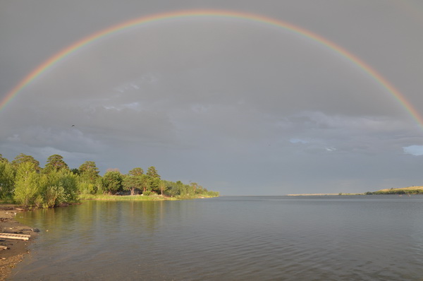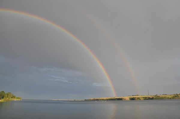 Красивая радуга после дождя, противоположный берег, казался каким-то нарисованным, на последнем фото двойная радуга: