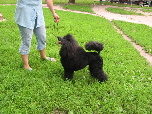 что касается угла ПЛС, думаю, что он в районе 100 градусов.... прямым плечом у этой собаки вроде бы, насколько можно судить по фото не пахнет что касается формата, думаю, что КДТ и у нее превышает несколько ВХ, эт нормально... квадратный формат, на мой взгяд, у пуделя подразумевает (по Дель Далю, полностью тут с ним согласна) то, что собака в стойке должна вписаться в квадрат что же касается шеи, то лично мне, хотелось бы видеть ее чуть длиннее, но, эта шея вписывается и в старый и в новый стандарт "умеренной, средней" длины... но это уже дело вкуса.. |