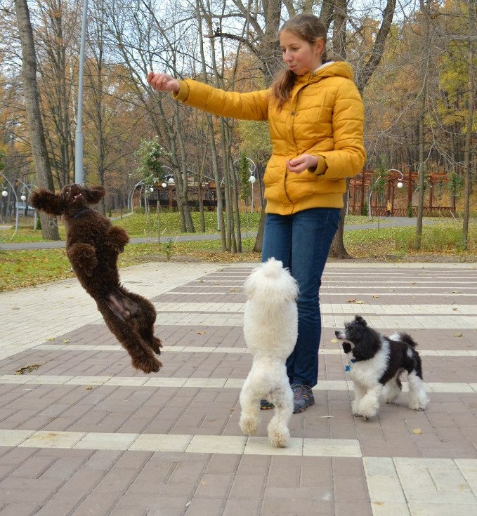 Всем привет из Воронежа!:) Встретились с Ириной на выставке. у меня на руках мои Хлоя, Ероха и Каспер. В середине сидит щенок коричневого большого пуделя Руф, плохо видно его, а у Ирины Марсик Умка и Тори:) Пудлобукетики :hb: