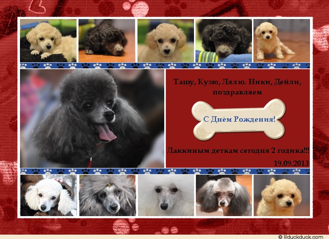 Вложение 69535 А мы вчера праздновали день рождения Лакки, 19.09.2013 моей любимой девочке исполнилось 5 лет! А два года назад в свой день рождения она стала мамой пятерых деток, это был большой подарок! В честь этого события, хозяев щеночков поздравили вот таким коллажем: Вложение 69536 И конечно, сестричку Лакки - Лолочку, которая живет у моей мамы тоже поздравили: Вложение 69537 |