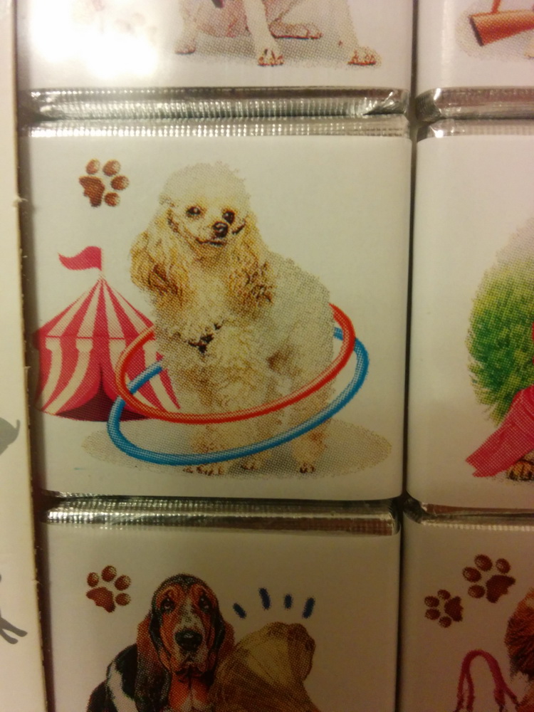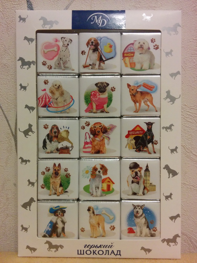 Недавно купила такие шоколадки с изображением собачек на обертке, в том числе есть и пуделёк. Сам горький шоколад вкусный, состав хороший. Вложение 77027Вложение 77028 |