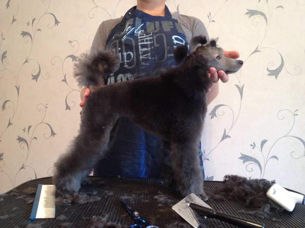 Давно не было пудельков. Щенок, серебро, 3,5 месяца, мелкий карлик. В жизни грудь не такая плоская получилась, как на фото после, но срезала все равно много, т к мягкая щенячья шерсть и стрижка не для выставки, а промежуточный уход. Фото с телефона, изв. за качество.