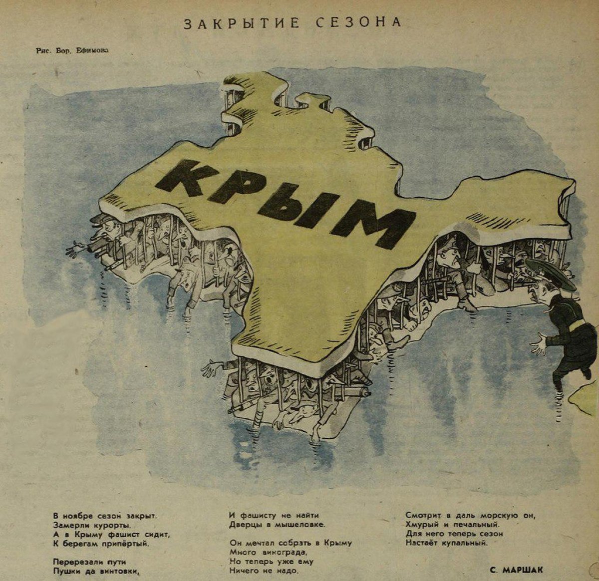 В интернете распространяется стихотворение Самуила Маршака, которое было написано в 1943 году, но, по мнению пользователей социальных сетей, отражает нынешнюю ситуацию с отключением электричества в оккупированном Крыму. Стихотворение разместил на своей странице пользователь Facebook Александер Кроливец. "Нострадамус отдыхает! Маршак и не подозревал, что события 1943 года повторятся в 2015-м! Только фашисты из другой страны!" — прокомментировал он стих. Воспроизводим стихотворение Маршака целиком. "В ноябре сезон закрыт. Замерли курорты. А в Крыму фашист сидит, К берегам припертый. Перерезали пути Пушки да винтовки, И фашисту не найти Дверцы в мышеловке. Он мечтал собрать в Крыму Много винограда, Но теперь уже ему Ничего не надо. Смотрит в даль морскую он, Хмурый и печальный. Для него теперь сезон Настает купальный". |