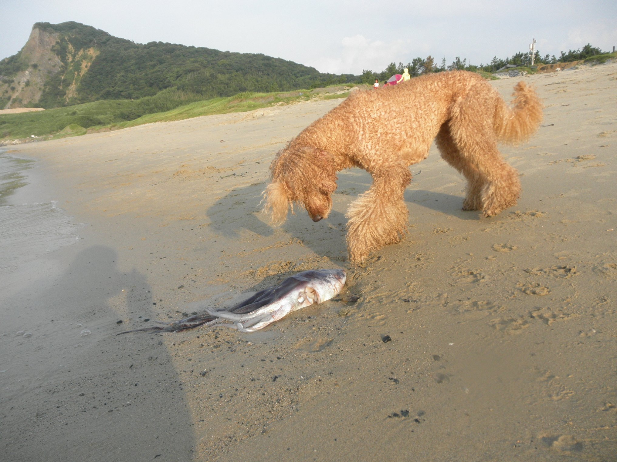 Соседи по пляжу поймали в воде большую каракатицу и маленького осьминога. Каракатица Стасю очень привлекла и Стася пыталась откусить от неё кусочек. Ну или хотя бы отковырять что-нить лапой.