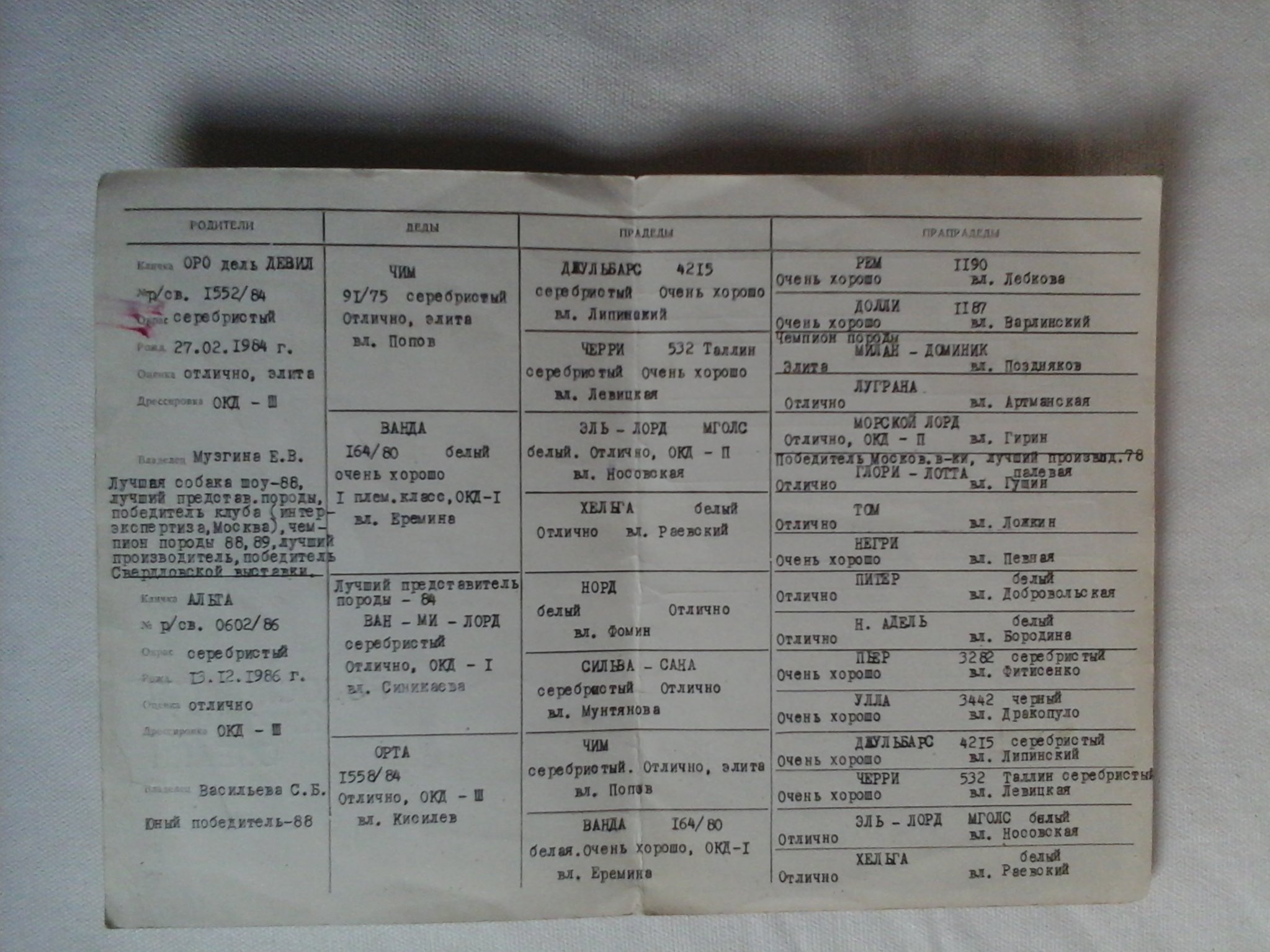 добавить номеров у меня не получиться, Вы правы:получили мы из Свердловска одну и ту же информацию по Оро дель Девилу. Мой Чивьен де Оро был получен от вязки Оро с племянницей.