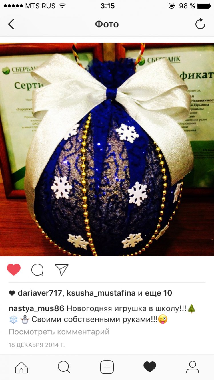 Заскринила с Инстаграм, больше нигде не могу найти. Это мы на Новый год делали игрушку на Новогоднюю елку, правда не знаю на какую, но в школе вроде говорили, что на городскую