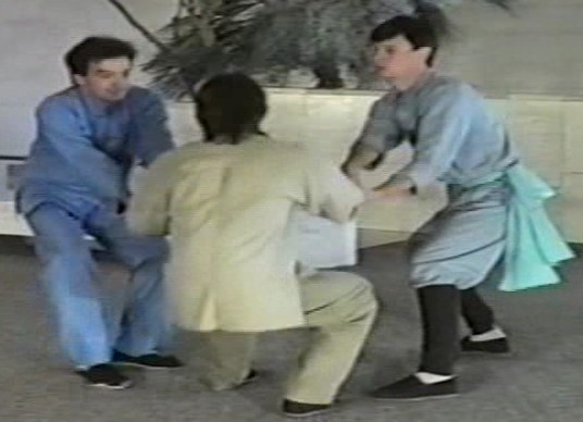 Анализ Смирнова он говорит руки не заводятся за голову без объяснений тут понимание одно может быть в видео Смирнова вначале его хватают за руки запястья он делает шаг вперед и противники закручены разворот за счет корпуса движения и ног руки не заводятся за его голову в айкидо есть похожие приемы это надо выучить с второго видео приемов 8 первых с напарником проделать просматривайте на замедленке например в Potplayer.Вот фото Смирнова первый прием из восьми в плейлисте название копия видео
