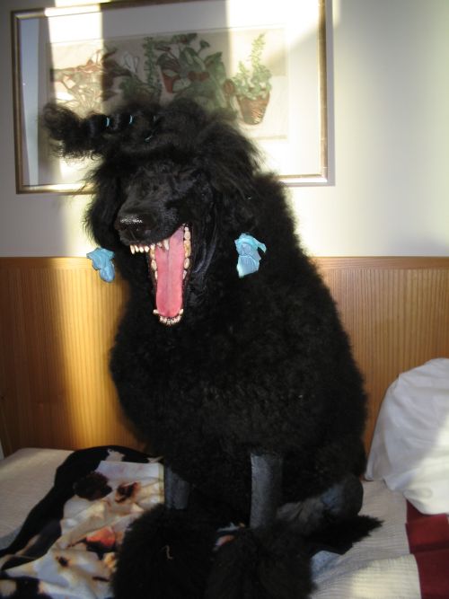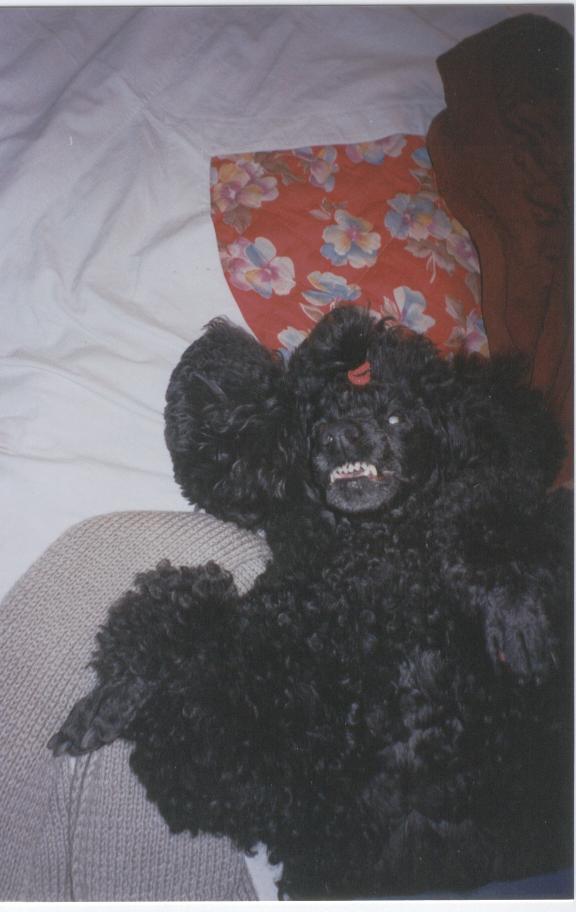 просто бывает иногда, когда собака улыбается, она натягивает губы и у нее открываются передние зубы в такой "улыбочке". не хотела прям так уж прямолинейно писать - не очень у меня в голове пудель совпадает с оскалом, а картинка нужна |