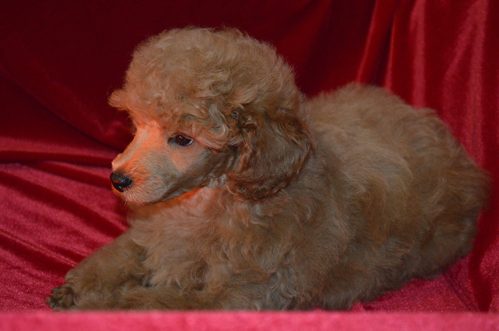 Очарование Нежный Друг, той пудель, кобель, окрас красный. Очень маленький нежный, ласковый мальчик. В 45 дней вес 711 грамм, рост 11,6 см в холке. В возрасте 65 дней, вес его 1110 грамм, рост 16 см. Свободен к продаже. _______________________________________