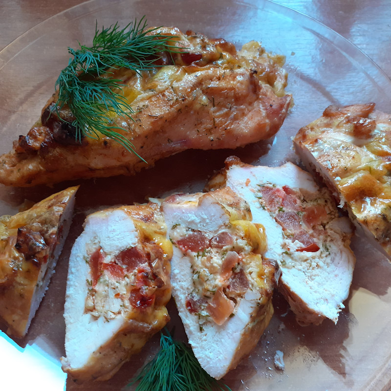 А главное быстро:)) Нам понадобится: 1. Филе грудки - 2 шт. 2. Помидор - 1 крупный 3. Сыр - 100 гр. 4. Зелень, чеснок 5. Сметана - 2 ст.л. 6. Масло, соль, специи. 1. Делаем в куриной грудке надрезы, чтобы получились "кармашки". 2. 1 ст.л. масла+соль+специи. Обмазываем куриную грудку и оставляем мариноваться. 3. А тем временем готовим начинку : помидор+сыр+чеснок+сметана. 4. В форму выкладываем куриную грудку. Фаршируем. И скалываем в некоторых местах зубочистками. 5. Отправляем в духовку на 20-30 мин при 180 градусах. 6. За 5 минут до готовности смазываем желтком!) ВСЕМ ПРИЯТНОГО АППЕТИТА) Смотрите прикрепленные фото ниже Видео рецепт вы можете посмотреть на моем канале _______________________________________
