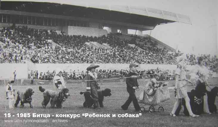 У вас ведь тоже должны быть интересные архивы! Поделитесь... КенияЛана Есть почти все, и они есть. Сканера пока нет. Как только, так сразу... Юля с Дизелем Да это та самая Виктория Попова, которая Фауна и уиппеты. Вера-Тим Такое же ощущение и у меня. Но, возможно, это старческое брюжжание, как во все века у старшего поколения по отношению к младшему. Возможно... Но в подкрепление к вашим словам приведу цитату из своего интервью 2001г, данного для "П-Р" (см. у меня сайте). На вопрос ВЫ ЗАНИМАЕТЕСЬ РАЗВЕДЕНИЕМ ПУДЕЛЯ С 1974 ГОДА – ОГРОМНЫЙ СРОК! РАССКАЖИТЕ ХОТЯ БЫ О НЕКОТОРЫХ ПРОИЗВОДИТЕЛЯХ И ЗНАМЕНИТЫХ ПОТОМКАХ СОБАК ВАШЕГО РАЗВЕДЕНИЯ я ответила, кроме прочего, вот что: За 20-25 лет число потомков, понятно, увеличилось и знаменитых среди них много. Хотя, конечно не сравнить, например, 1990 год (последний год моего "президентства") с 2001-м по числу рожденных щенков. В клубе "Большой пудель" МГОЛС, который до 1990 года работал как коллективный питомник, в тот год родилось 38 пометов (около 300 щенков!), да еще наши кобели осчастливили 50 иногородних пуделих. Вряд ли тогда хоть кто-нибудь предполагал, какие трудности подстерегают этих великолепных собак, клуб, и вообще все отечественное собаководство. Но, пока мы радовались такой популярности породы и гордились высокой оценкой наших собак экспертами FCI на выставках дома и за рубежом, в недрах нашего собаководства уже начался распад родственных породных групп, дробление племенного ядра и растаскивание кусочков по личным, независимым ни от чего и ни от кого, питомникам. Я тяжело переживаю потерю для породы многих вычищенных кровных линий и семейств, сколько труда погибло, они ушли, как вода в песок… Ну да ладно... Вот вам еще несколько картинок из прошлого. Выставка МГОЛС 1985года в Битце. Дети клуба "Большой пудель" для участия в конкурсе "Ребенок и собака" приготовили театрально-цирковое представление. Обратите внимание как забиты трибуны. _______________________________________