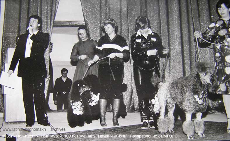 Празднование 100-летия журнала "Наука и Жизнь". Поздравления от многих интересных людей (например от Булата Окуджавы) и весьма солидных организаций. Заключительный аккорд праздника - поздравление от МГОЛС. На фото молодой, но уже тогда умевший правильно и красиво говорить, Женя Ерусалимский. Первым на фото виден серый кобель Ван-Милорд, а попросту "Ванька Синикаевой" - звезда выставок тех лет. Чуть дальше Злата Ахмедзянова - тоже звезда, только показательных выступлений по ОКД и ЗКС (!!!!) а также по послушанию. Она коричневая, но кажется на этом снимке черной. Такая вот была темно-коричневая. За ней Нард-Оникс и Вика Попова. Все. С вас пока хватит. Доставайте свои архивы. А я пошла достирывать и достригать свою стаю. Вчера подстригла 4-х из шести. Троих из них вымыла и достригла. Нужно закончить процесс... Ушла
