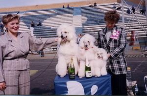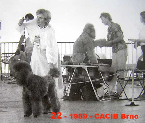 А еще один раз такой же визг и хохот стоял когда во время одного из забегов афганов у меня сорвалась с пружинного карабина ЗЮКА, присоединилась к афганам, обогнала их на повороте и в одиночку понеслась за механическим зайцем. Пробежала метров 100 пока поняла, что бежит одна. А афганы в это время барахтались в ограждавшей дорожку сетке и жутко орали. Их туда загнала невольно ЗЮКА. Она ведь сделала резкий поворот, "сброс" налево, как все пудели, овчары и гончаки делают и "подрезала" их. А афганы так не могут, они плавно в поворот входят, вот и вошли, но только в сетку. Под рёв трибун ЗЮКА оставила зайца и вернулась к афганам чтобы посмотреть что случилось. Афганов удалось выпутать из сетки и отправить на старт. ЗЮКА никому (и мне) в руки не давалась и вместо этого тоже побежала на старт, где втиснулась между приготовившимися к старту афганами. С ними опять случилась истерика. На трибунах хохот повальный - представьте еще меня, бегающую медленнее чем ЗЮКА и еще пару-тройку крепких мужиков, пытающихся ее поймать. Возбужденная ЗЮКА не понимает почему ее хотят лишить такого удовольствия... Наконец ее умудрился схватить в охапку один из владельцев афганов, стоявший во второй стартовой группе. Этот забег мы сорвали. Еще сорвали шквал аплодисментов. Досматривать бега я не стала. Уходя всё оглядывалась - а вдруг поймают и надают мне по шее за свой позор. Ага, добавлю рост ЗЮКИ - 59 см, косая длина 61см, объем груди и крупа впечатляющий. Не слишком изящная была... Вот она на первой международной выставке, где принимали участие наши пудели - ИНТЕРКАНИС Брно-1989. Первый САС, полученный пуделем нашего разведения. _______________________________________