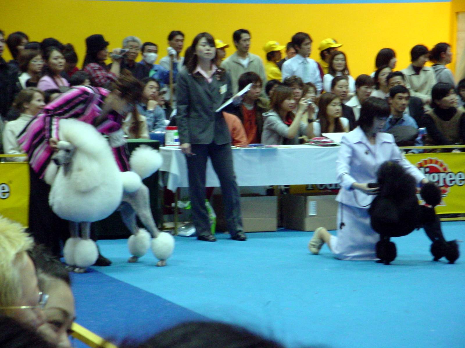 Я на сей раз позволила себе быть не совершенной и расслабленно ( после обеда) прибыла чисто на шопинг и посмотреть Бест Ин Групп и Бест Ин Шоу.А Микаеля в конареечном ринговом костюме ( позже он переоделся вобычный) и в компании громогласного брУнета я встретила именно на шопинге ( брунет приценивался к синтетическому пуделю ( кукла-модель для стрижки) и всё спрашивал, а нет ли такого-же, но с натуральной шерстью?Прикалывался... так ша я оттягивалась во весь рост по торговым палаткам ( купила таки Роялю!) и абсолютно мне не хотелось торчать с фотоаппаратом день-деньской под рингом.Мне просто надоело делать эти репортажи для себя ( всё это я уже фотографировала нираз).Поэтому решила просто получить удовольствие от созерцания и прикупить чего-то полезного ( даже каталога в руках не держала).Несколько фоток с группы всёже сделала.Всего на группу вышли 3 пуделя : большой белый кобель, малый чёрный кобель и белый тойский смашевичь.Омуровский той был только четвёртым в расстановке.Группу выиграл мальтиз! |