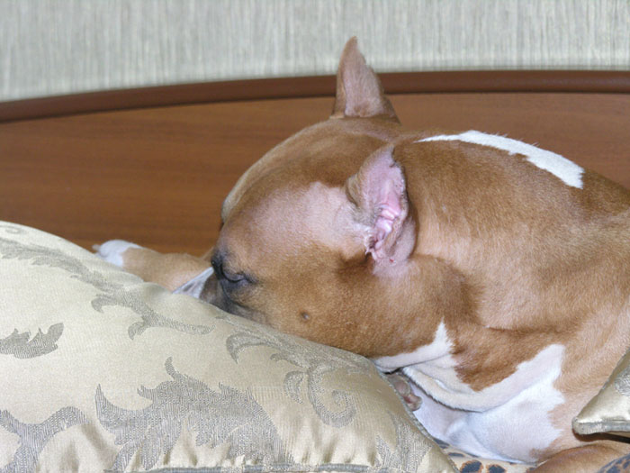 Это типа наш той-пудель. Иногда мы разрешаем своей стаффке почувствовать себя таковым и покайфовать на хозяйских подушках. Но только иногда!!!