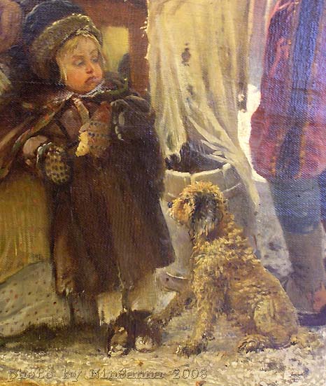 Особенно важны для меня оценки питерцев. Ничего там не напутала? Всё ведь писала по памяти. Я не была в Питере с 1991 года. Но, оказалось, очень прилично в нем ориентируюсь. Первая моя цель - Русский музей. И я дошла до него от Московского вокзала самостоятельно. Совершенно точно вышла. От Русского музея большие впечатления и несколько фотографий. Но никак эти впечатления и фото не вписывались в канву рассказа. Если придумаю как это сделать - добавлю. Я и осталась-то на день после выставки именно из-за Русского музея. Даже не из-за его коллекции, а из-за выставки художника Хржановского. Это (насколько мне известно) первая настоящая выставка уже ушедшего художника. Власти его не любили, а он не любил их. Его сын тоже художник, только мультипликатор. Талантливый. Но судьба такая же трудная. Не уверена, но, может быть, кто-нибудь видел его фильм "Стеклянная гармоника". А еще он работал вместе с Норштейном на несколькихз его знаменитых картинах. Фильм "Стеклянная гармоника" был запрещен в советское время и скрытно показывался с одной авторской копии. Я видела его много-много раз, наизусть знаю. Много слышала об отце. Теперь увидела и его работы. К сожалению, оказалось, что "гостевые" экспозиции, а также представленные в музее частные коллекции нельзя фотографировать. Так что - несмотря на то, что я заплатила за право фотографировать - снимков картин Хржановского у меня нет. С горя сделала несколько снимков картин из основной экспозиции на которых присутствуют собаки. Вот вам, например, фрагмент картины Маковского. Хороши оба! Да? Есть ещёёёёёё.... _______________________________________
