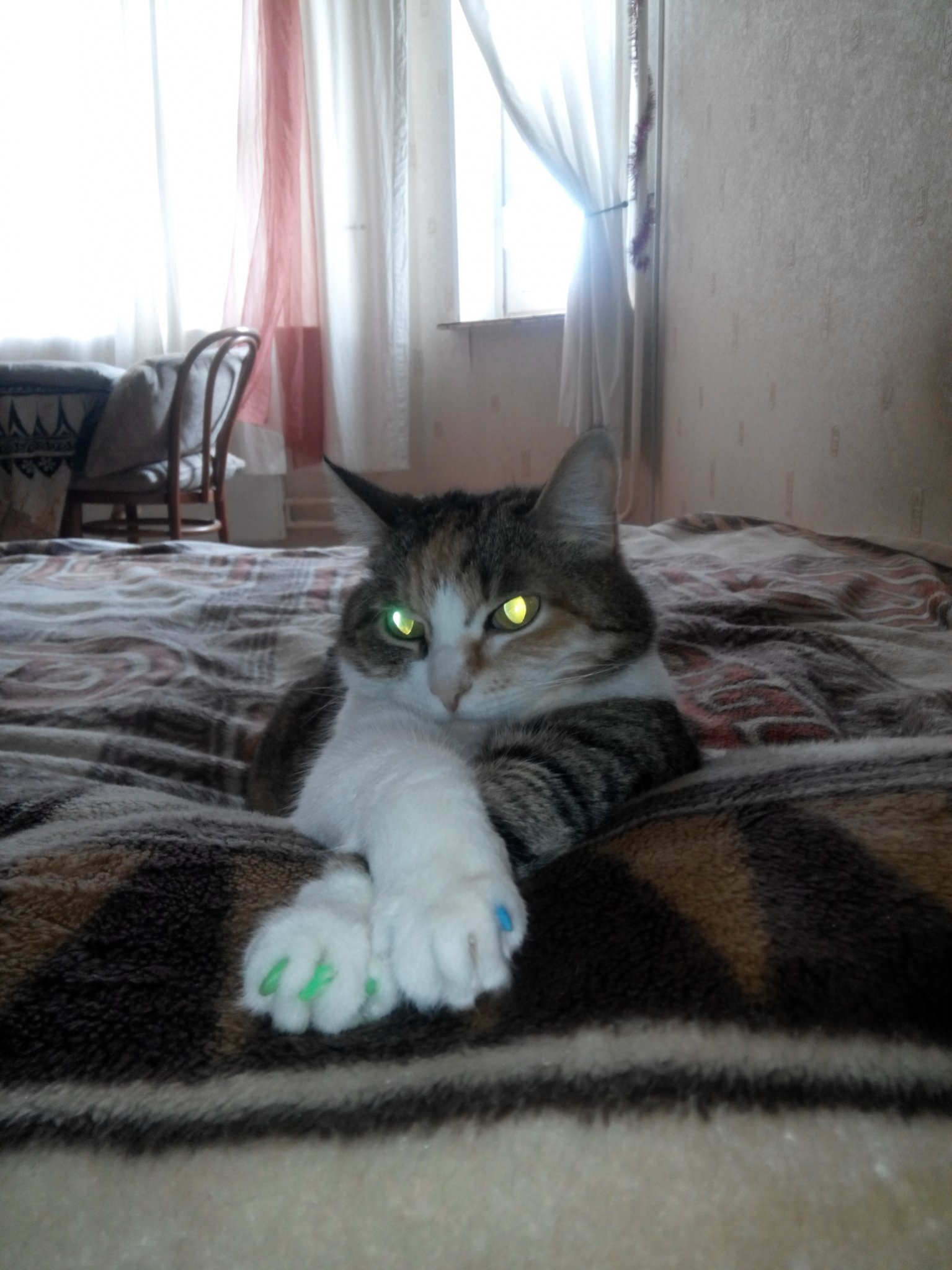 Poodlezimaletto, а Вы коготочки под накладки прячите? И как эффект? Я своим максимально коротко стригу. Дочанка об своё кресло точит, а петрушка может только 2-3 раза и пыталась. Не точит она коротки.