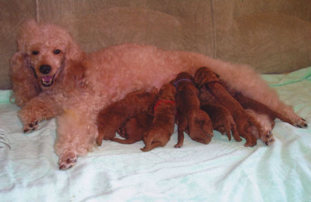 Вот любимчик форума Артошка в приемном помете Б. Артоша сейчас яркий абрикос. Его молочные брат и сестра тоже яркие абрикосы, но светлее чем он. Артошу вязали с ярко-абрикосовой сукой (не темной, умеренно интенсивного окраса) - щенки ярко-абрикосовые, средней интенсивности. _______________________________________