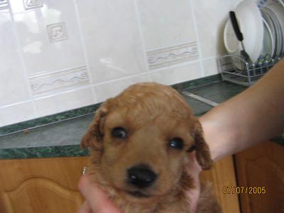 окрас щенка при рождении очень светлый серовато-палевый, такое впечаление - как через воск проглядывается окрас. А потом эти щенки быстро набирают окрас и практически ничем не отличаются от однопометников сразу рождённых красными. у меня есть такая красная сука, рождённая светлой и сильно набравшая окрас с возрастом. к сожалению первое её фото сделано не очень качественно и там она уже не такая "беленькая" как была вначале. Лиза только открыла глазки |