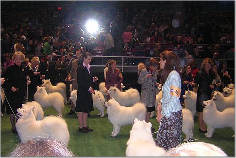 Самоеды ( с хендлерами) ожидают выхода на ринг 2006 Wестминстер, в тот год на шоу было представлено больше 30 Американских Чемпионов етой породы: