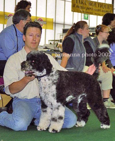 Rococo, второй - тоже португалец. Стрижки у них допускаются 2 разные: "лев" и "модерн". В "модерне", по-моему, только собаки до 12 месяцев могут выставляться... Окрас черный с белыми пятнами допускается, но вот такой "арлекин" - не знаю, уж слишком много белого...