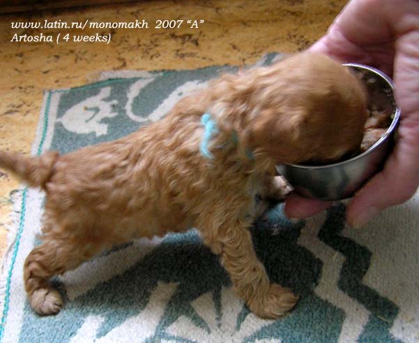 Помёту "А" исполнилось 4 недели (уже!!!) и дважды в день они тепрь едят совсем как настоящие собаки Вот и Артоша. "Кушать подано!" _______________________________________