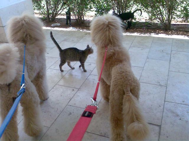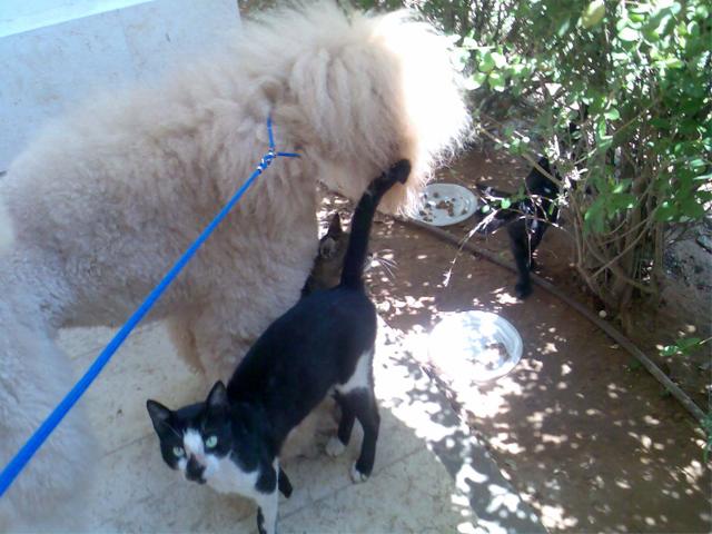 А вот ещё девочки, сценка из нашей "уличной" жизни... Около дома живут кошки , которых мы кормим и лечим ... Еду я им выношу, когда идём гулять с Санником и Тулипом, и они видно серьёзно думают, что Санник и Тулип их кормят :)
