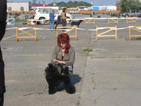 чтобы не подумали на окрас ТИП ТОПА что это погрешность освещения на фоте... фот Вам еще одна фотка карлицы из чисто черного разведения, на той же выставке, с тем же освещением... это ГЛЕН БИОНСА....