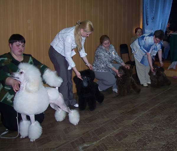 у меня нет ни одного фото, тк выставить десяток собак, при этом созвать всех остальных в ринг, а также выдать всем (ЛЮ, ВОВ) участникам бэста призы итак было реально свыше моих сил. Фотки с моно есть у Vitaa и Duchess - надеюсь, они дополнят картину. Условия проведения моно были максимально приближены по качеству к экстремальным, так что качество фот скорее всего не супер, но уж какие есть - всё лучше чем совсем ничего. Сибирские Язвы добавил(а) [date]1214152204[/date]: экспертизу проводила Ковалёва Татьяна. к сожалению нельзя сказать чтобы очень адекватно... Видимо пятилетний перерыв в судействе всё ж\е несколько сказался((( ТО Й П У Д Е Л Ь ОКРАС ЧЁРНЫЙ Кобель. Класс промежуточный 1. ЮНИВЕРСАЛ РОЙАЛ ФЛЭШ МЭДЖИК МИСТЕРИ (ИнтерЧ Делисс Серпантин Эльдорадо х ЧР Чечетка из Зимних Грёз) вл. Филоненко-Чоповская, Омск - оч. хор (типа - за хвост каралькой) Сука. Класс щенков 2. ЧАО-КАКАО ИЗ КАЗАНСКОГО ХАНСТВА (InterCh Чингихан из Русского Двора х GrandCH Авэ Фрайер Ерика Шалунья) зав. Иванова, вл. Филоненко-Чоповская, Омск - ЛЩ выставки Сука. Класс промежуточный 3. СЛАВЯНКА СМУГЛЯНКА (InterCh Dalin On My Good Times х ЧР Славянка Фарфала ди Нотте) зав. Баклушин, вл. Леонтьева, Омск - КЧК ВОВ 4я в тоях ОКРАС КОРИЧНЕВЫЙ Кобель. Класс чемпионов 4. Чемпион России, 2хКЧК DE IMPERIUM AURI ZEFIRO TROPICALE 07.03.07., RKF 1961662, (InterCh Sharades Love American Style x Великолепный Пудель Эллис) зав. Сутуева де Дюранд, вл. Коневы, Новосибирск - КЧК, ВОВ, Лучший Той Сука. Класс промежуточный 5. GLAMURNAYA SHTUCHKA IZ SOZVEZDIJA DEVY (InterCh Sharades Love American Style x GrandCH Steysi Iz Sozvezdija Devy) зав. и вл. Коневы, Новосибирск - КЧК ЛС ОКРАС СЕРЕБРИСТЫЙ Сука. Класс юниоров 6. СЕРЕБРЯНЫЙ ВЕК БРИЛЛИАНТ ЛИТЛ СТАР (ЧР Серебряный Век Лакомый Кусочек х ЧР Серебряный Век Единственная Моя) зав. Старчак Е., вл. Захарова Н, Омск - ЮКЧК, ЛЮ, ВОВ, 3я в тоях ОКРАС АБРИКОСОВЫЙ Кобель. Класс юниоров 7. АМБЕРС ФЭНТАЗИ АМЕРИКАН БОЙ (ГрандЧ Stardust Gently Bon Markqise x ГрандЧ Амберс Фэнтези) зав. Алина-Шабуцкая, вл. Зюбанова И. А. Томск - ЮКЧК, ЛЮ, ВОВ 2ой в тоях Сука. Класс юниоров 8. АМБЕРС ФЭНТАЗИ АМАЛИЯ 03.03.07., JUA 170, РКФ 2084169, (ГрандЧ Stardust Gently Bon Markqise x ГрандЧ Амберс Фэнтези) зав. Алина-Шабуцкая, вл. Луканов А. В., Новосибирск - ЮКЧК ОКРАС КРАСНЫЙ Кобель. Класс юниоров 9. АМБЕРС ФЭНТАЗИ АЛЛЕГРО (ГрандЧ Stardust Gently Bon Markqise x ГрандЧ Амберс Фэнтези) зав. Алина-Шабуцкая, вл. Вервина, Томск - ??? Сибирские Язвы добавил(а) [date]1214152752[/date]: М И Н И А Т Ю Р Н Ы Й П У Д Е Л Ь ОКРАС ЧЁРНЫЙ Кобель. Класс чемпионов 10. SLAVYAN ZHIGOLO SHER AMI (CH Slavyan Karden x Slavyanka Farfalla Di Notte) зав. Баклушин, вл. Бурова С, Тюмень - КЧК, ЛК Сука. Класс победителей 11. Юный ЧР, Чемпион Чемпион России, Каз., АНКОР, РФСС, 8хСАС, КЧК AKVA VITAE ALISA LISA 17(Интерч Toyway Chain King x Zhivchik Anutka Yasnye Glazki) зав. Кириенко, вл. Захарова Н, Омск - КЧК, ВОВ, 2я в миниках ОКРАС БЕЛЫЙ Кобель. Класс щенков 12. ГЛАМУР ДОЛЛС ПОКЕР 08.08.07, щ\к, (ЧР Джек Пот из Зимних Грёз х Умильная Мордашка из Зимних Грёз) зав. Мукомела, вл. Чернышова Е, Омск - персп. ОКРАС КОРИЧНЕВЫЙ Кобель. Класс промежуточный 13. ОЧИ ЧЁРНЫЕ МАЛЫШ ДЭНДИ 31.08.06., AUF 4926, РКФ 1961627, (Ютана Алдарон х Госпожа Моей Души) зав. Внукова, вл. Мельникова В. И., Северск - КЧК, ВОВ 1 в миниках 3 в финале ОКРАС СЕРЕБРИСТЫЙ Кобель. Класс победителей 14. 2хСАС МЭДЖИК МИСТЕРИ УНИВЕРСУМ (ГрандЧ Очарование Новый Фаворит х ГрандЧ Невский Дом Сьюзи) зав. и вл. Филоненко-Чоповская, Омск - КЧК, ВОВ 3 в миниках Сука. Класс открытый 15. МОНЕТКА СЕРЕБРЯНАЯ (ИнтерЧ Айри Арабеска Бластер х ГрандЧ Василиса Прекрасная) зав. и вл. Тищенко, Новосибирск - КЧК, ЛС ОКР