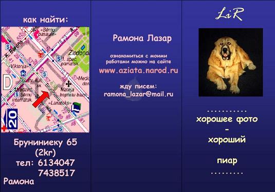 Рамон, это будет на три части складываться (гармошкой)? Eglantine добавил(а) [date]1069689635[/date]: Рамон, попробуй под фоткой собачки (я думаю первой), шрифт текста поменять и покрупнее сделать и может цвет поярче, Оно должно больше остального текста выделять, что это фото, а неч то-то там еще. _______________________________________