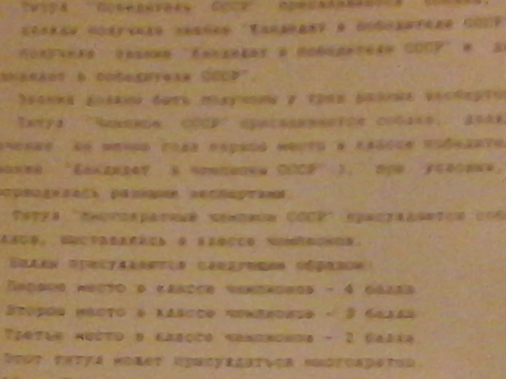 По правилам Всесоюзного Пудель Клуба звание Победитель СССР присуждалось собаке, которая 2 раза получила звание Кандидат в Победители СССР или 1 раз Кандидата и 2 раза Резер.Кандидат.