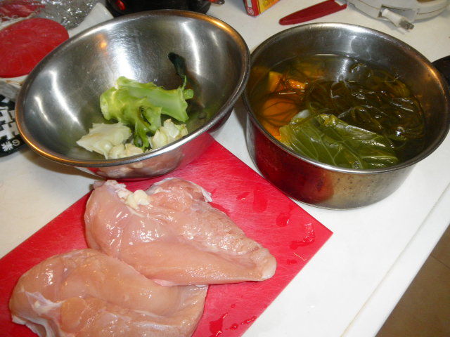 Тут куриные грудки, отвареннеые "ножки" от брокколи и цветной капусты, а так же отварные тыква, пара верхних листов с белокочанной капусты, морская капуста.