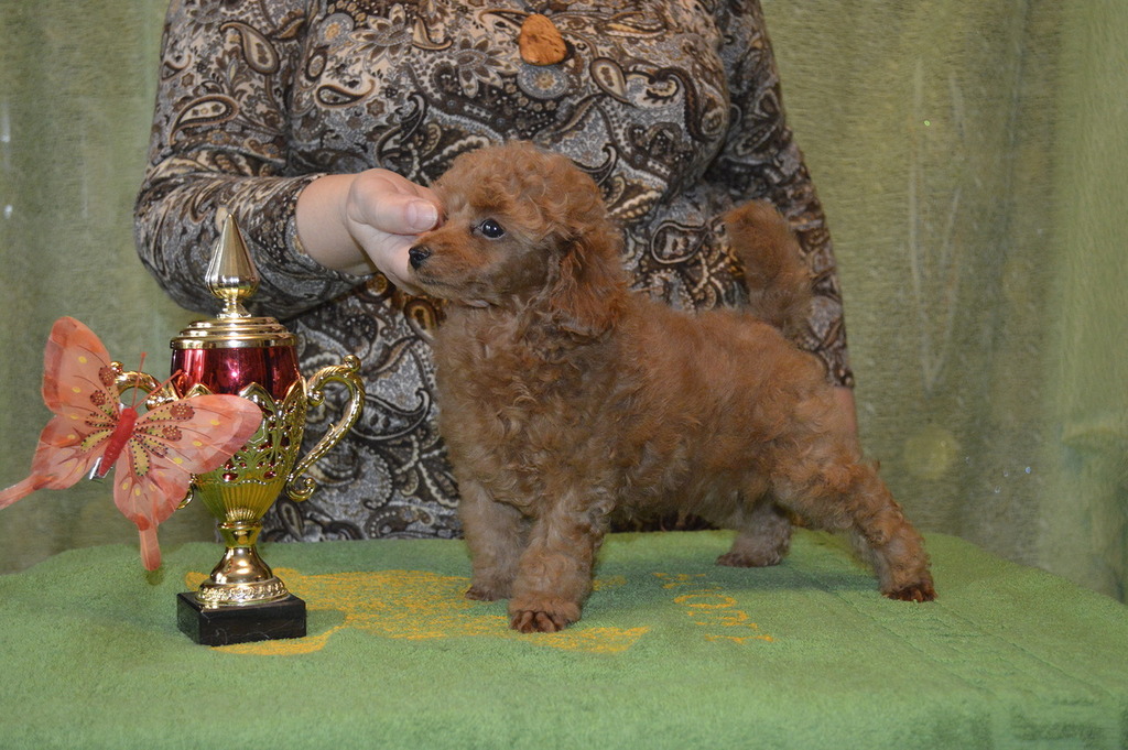 Очарование Нежный Друг, той пудель, кобель, окрас красный. Очень маленький нежный, ласковый мальчик. В 45 дней вес 711 грамм, рост 11,6 см в холке. В возрасте 65 дней, вес его 1110 грамм, рост 16 см. Свободен к продаже. _______________________________________