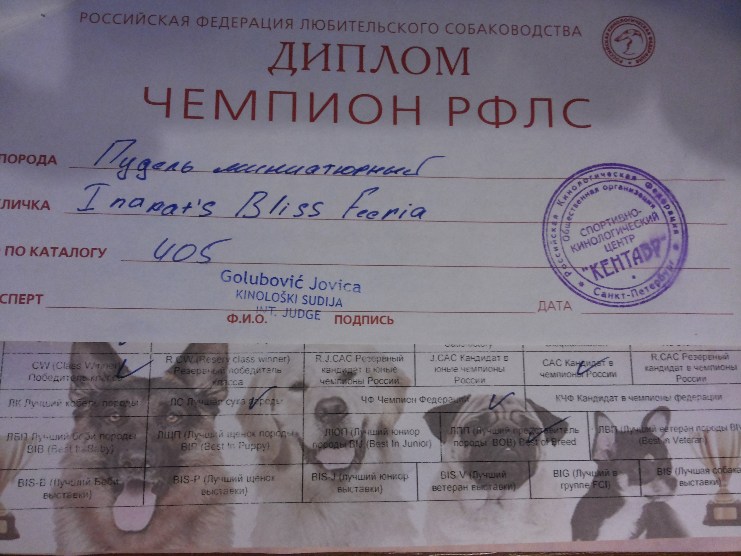 Ааа... понятно. Про эти титулы я не подумала.Иногда, на выставке ранга чемпион РКФ получаем титул Чемпион РКФ, но, честно говоря, чаще всего не оформляем его.