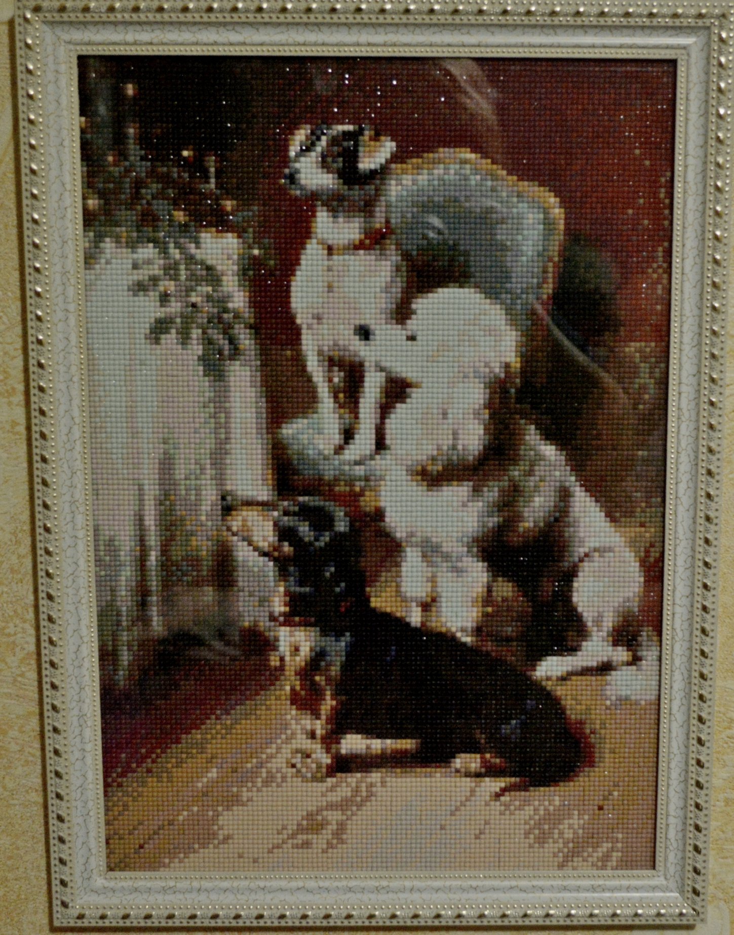 А мне и заказывать больше не хочется как-то...из-за того,что большая вероятность опять получить брак(((. Вот я смотрю на своих пуделей серебристых...вроде бы красиво, но мрачноватые они какие-то... Ну и то что ряды "поползли" из-за поддсохшего клея меня конечно расстроило,хотя когда на стене картина висит"поползших рядов не видно _______________________________________