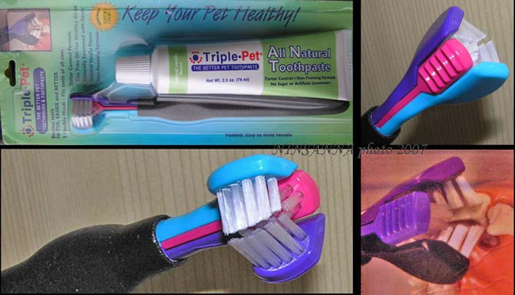 Посмотрите какой набор для ухода за зубами собаки привез вчера сын из США. Специально сфотографировала всю упаковку, чтобы вы смогли переписать название - возможно этот набор есть в Интернет-магазинах. (Я еще не проверяла). Сняла покрупнее головку щетки. Сделала для вас коллаж. Смотрите! Оригинальная трехголовая щетка за один проход касается всех поверхностей зуба. Спинка красной щетки (средняя) специально усилена ребрами для того чтобы не пострадала если собака сомкнет зубы. Справа видите - - крупно головка тройной щетки. - внизу фото ее работы на зубах. _______________________________________