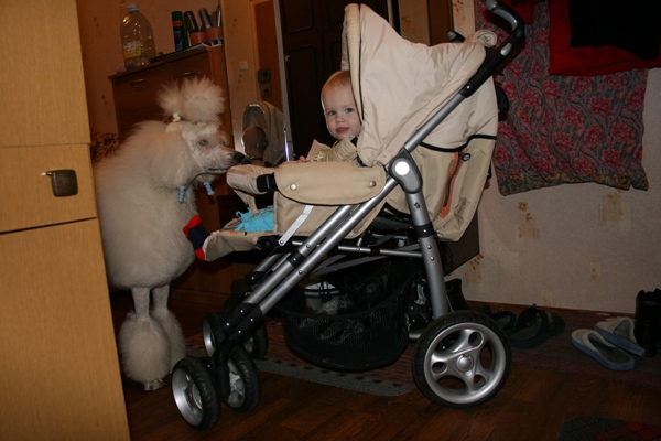 У меня кобель который может ломануться.... А тойку просто раздавить или лапу сильно прищемить, визгу на весь подъезд, я еще и над животными глумлюсь, видите ли :))) А это чревато на лестнице в подъезде... просто скидываю поводок ему на шею.. а сама пи тихоньку спускаю коляску по лестницам :))) Ребенок естественно в коляске... ТОже вездеход, дома сфоткались без зимней одежды :))) |