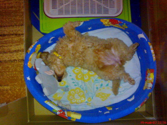 А Эрике с раннего детства частенько приходилось доказывать, кто главнее. Наверное потому, что она до месяца все-таки росла в стае и ей приходилось стоять за себя, а у Дезики выпал период социализации в собачьем колективе. А вот от ладони-"нельзя" Эрика отказывается супер-театрально, морду лапами закрывает, пятится, уклоняется и т.д. Она с детства - натура креативная (вот так мы всегда спали): |