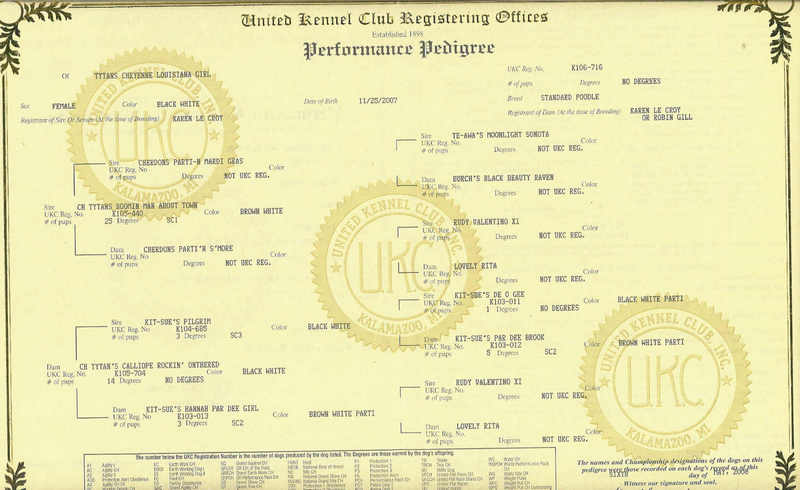 Outia добавил(а) [date]1222723998[/date]: Вот тут: TYTAN’S CHEYENNE LOUISIANA GIRL née le 25/11/2007 en Louisiane aux Etats Unis. Pedigree AKC et UKC. Bicolore noire et blanche. Eleveuse: Karen LE CROY “Tytan’s Parti Poodle” Shreveport, Louisiane, Etats Unis. |