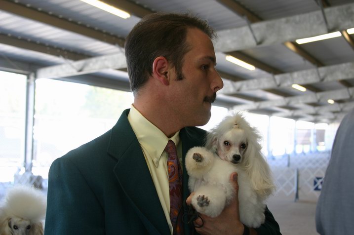 ну и потом, он просто не пошел с хендлером. сгорбился, оставил зад в сторону и опустил голову. на сравнение на резерв во второй день я вывела его сама - ну совсем другое дело - летел, как птица, жалко только что плохое впечатление он уже произвел. вобщем, хендлер от него отказалась, думаю, шансов у нас закрыться тут нет, особенно с ограниченным показом. ну и ладно, тогда расслаблюсь и буду получать удовольствие, тем более, что отработала я его отлично, без ложной скромности :) даже в свободной стойке научила стоять. выставки очень хорошо организованны, 1200 собак распиханы по 10 рингам и судейство заканчивается к 14 часам :) лая нет, у истеричных брехунов подрезаны голосовые связки, поэтому орут они шепотом. расстроило покрытие - выставка проходила, как бы это помягше сказать, в сарае... на ранчо, где проходят выставки всякого скота. поэтому на основных рингах покрытие было - засохшая грязь. при этом, перед тем, как она засохла, ее разравняли трактором. упасть можно было только так, у входа на каждый ринг висели таблички с напоминанием, что мол, не бегайте на экстремальных скоростях и не делайте резких поворотов, а то упадете. ну это то еще мелочи, потому что к обеду грязь вытоптали и в воздух поднялись тонны пыли. фотографировать со вспышкой было нельзя - собаки получались, как в тумане. по этой же причине, я не осталась на Бест, заложило нос и стали подозрительно чесаться глаза. поэтому я посмотрела последний ринг - стандартных пуделей, и поехала домой. кстати, карликовые породы, терьеры и пудели выставлялись на асфальте, там временные загоны для скота разобрали и сделали четыре ринга :) Sivka добавил(а) [date]1099924604[/date]: Цитата: