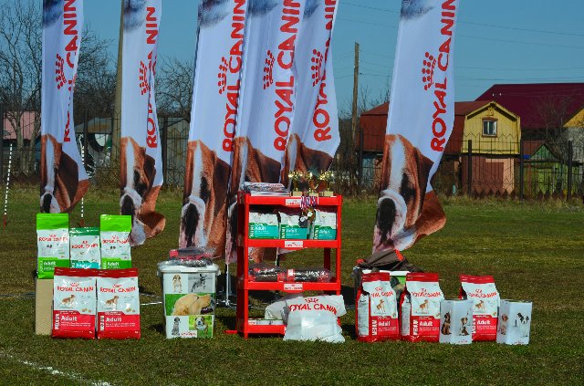 Роял Канин очень постарался сделать это мероприятие ярким и праздничным (я подозреваю, что они тоже преследовали какую-то стратегически важную для них цель...) - развевающиеся флаги, баннер, пъедестал с призами, образцы кормов - все это очень украшало скромное футбольное поле. А когда накануне на нашем форуме продемонстрировали наградные кубки, то даже у меня слюнки потекли...
