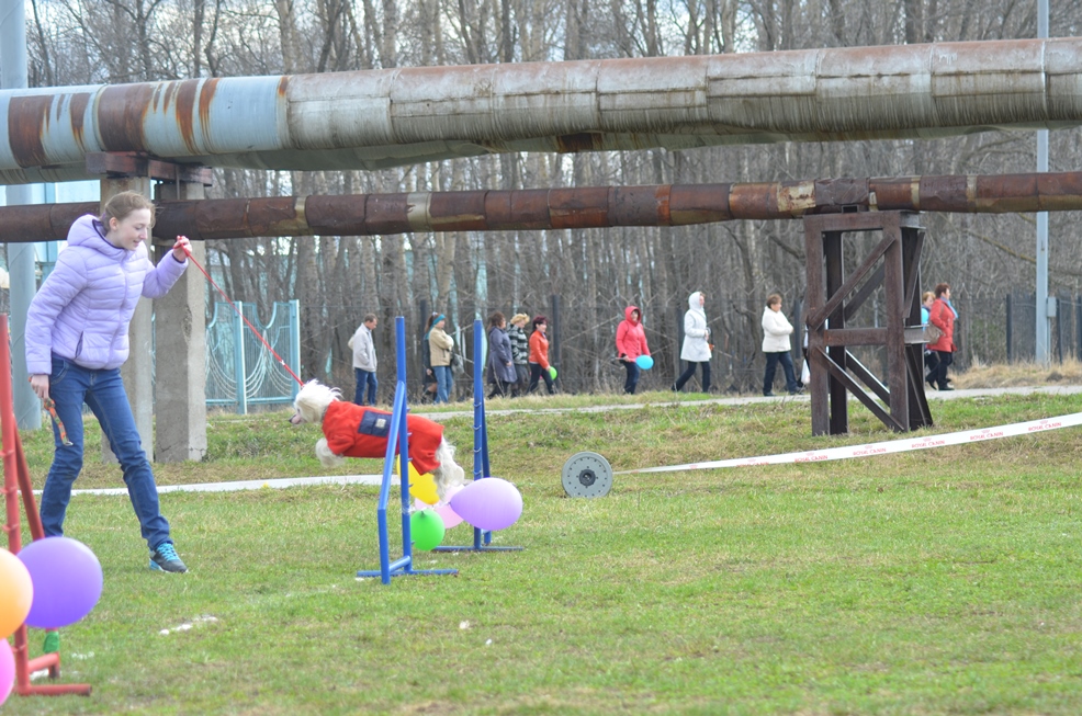 Всех участников разделили на 2 группы: "Дети" и... "Те, кому за 30-дцать". Всего было 3 конкурса. 1 - эстафета. Эстафетной палочкой у одной команды служил пуллер, у другой - собачья игрушка. Каждый участник с собакой по очереди должен был преодолеть простой барьер, коротенький слалом, еще один барьер из шариков. и то же самое на обратном пути, затем передавал эстафету следующему. Если собака не хотела-не умела проходить препятствие - это должен был сделать хозяин. Старались все участники, но... победила молодость! Мы с дочкой были в разных командах, она с Кариной, а я с Мэги. |