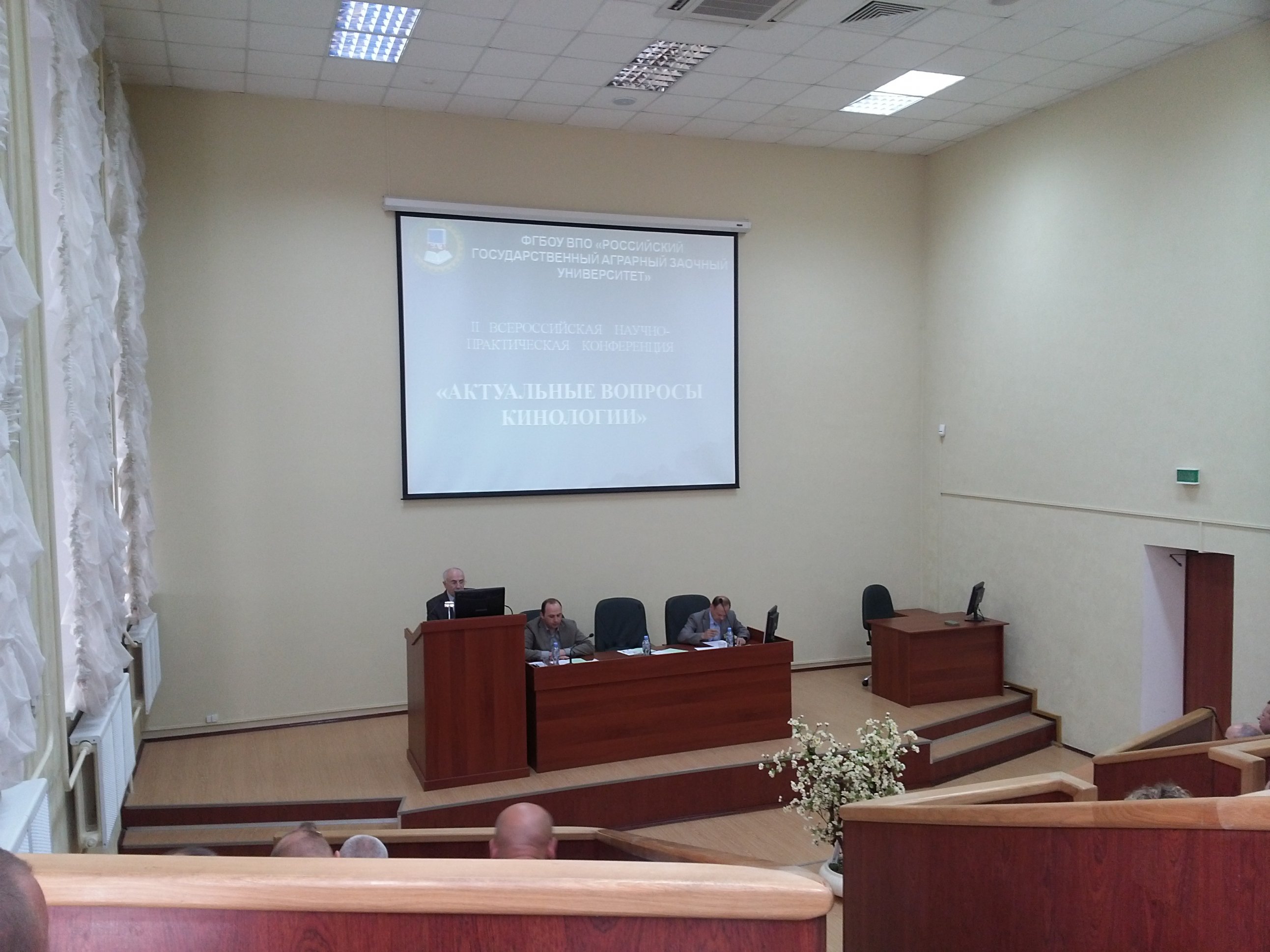 Спешу поделиться новостями.Сегодня, 21 мая , состоялась Вторая Всероссийская научно -практическая конференция " Актуальные вопросы кинологии". Организаторами выступили Министерство сельского хозяйства Российской Федерации ,Федеральное государственное бюджетное учреждение высшего профессионального образования " Российский государственный аграрный заочный университет " при поддержке компании " Royal Konin ". На пленарном заседании выступил ректор университета Дубовик Владимир Анатольевич ( доктор сельскохозяйственных наук , профессор , Лауреат Государственной премии Российской Федерации в области науки и техники. ) ; декан зооинженерного факультета , доктор сельскохозяйственных наук , профессор Делян Ашот Суренович , зав. кафедрой зоологии академии им. Тимирязева - доктор наук , профессор Блохин Геннадий Иванович. На меня произвели сильное впечатление выступления некоторых участников конференции. СОРОКИН Валентин Михайлович , начальник ФКУ " Центр кинологического обеспечения МВД России" - его доклад потрясающе умнО и четко осветил вопросы и проблемы отечественного собаководства , рассказал о создании школ повышения квалификации кинологов в Ростове ,на Дальнем востоке , об Уфимской школе. Основной задачей изначально они видят устранение пробела по племенному разведению , отслеживание отборных линий. Выступление Федоркова А. Н. ,ген.директора ООО " Реквизит ", рассказало о новейших отечественных разработках учебных реквизитов для собак с имитацией взрывчатых веществ и других изобретениях. Матыченко Алла Валентиновна , доцент кафедры генетики и разведения , помимо высоко профессиональных исследований в своей области имеет серьезную научную базу по работе с людьми , в том числе с привлечением собак , эффективно помогает больным ДЦП и досконально разработала восстановительную терапию для собак .Сударев А. Е. ,руководитель научно - методического кинологического Центра РГАЗУ , рассказал о своем видении совместной деятельности с моим Центром на благо детям и развитие науки . Он считает , что объединение научных баз и привлечение специалистов высокого класса способно продвинуть отечественную кинологию , даст дополнительные рабочие места , и вместе мы эффективнее сможем помочь людям на этапах реабилитации и лечения от различных недугов психосоматического характера .Я выступила с докладом .Попытаюсь его расширенную версию сейчас показать..