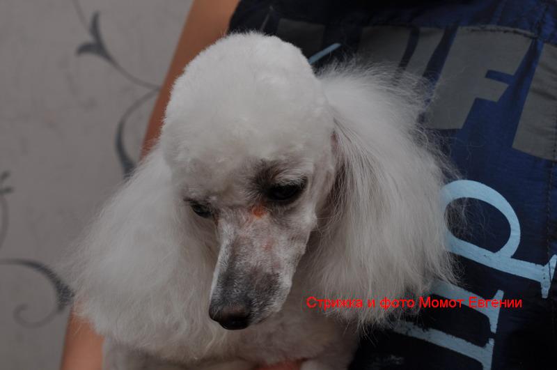 У у той собаки шерсти мало на голове, и по корпусу тоже. Зачем делать большую шапочку, тем более не из чего? Или вы имеете между глаз? линия чуть чуть может завышена, но это сделано для того, чтобы шерсть не мусолилась выделениями из глаз. Вот пример шапочки у этой собаки, когда у нее была шерсть на голове нормальной длины. _______________________________________