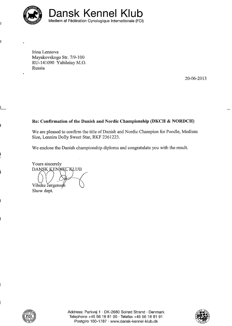 Lennira Dolly Sweet Star получила CACIB, ВОВ и СС на международной выставке в Дании. Таким образом, Долли получила чемпионский титул третьей страны в Скандинавии (чемпион Швеции, полученный в конкуренции с 19 черными суками, и Чемпион Финляндии, полученный на Finnish Winner), и закрыла титул Nordic Champion.