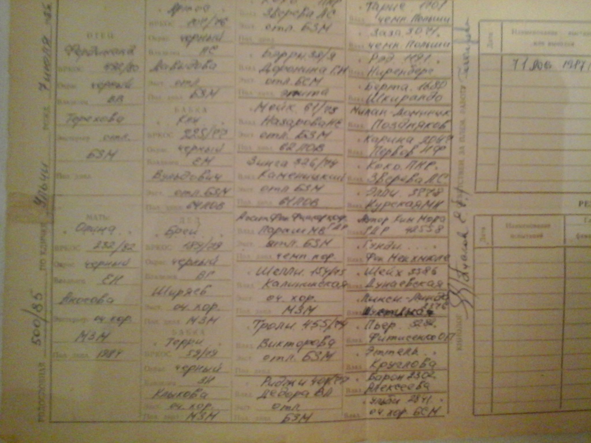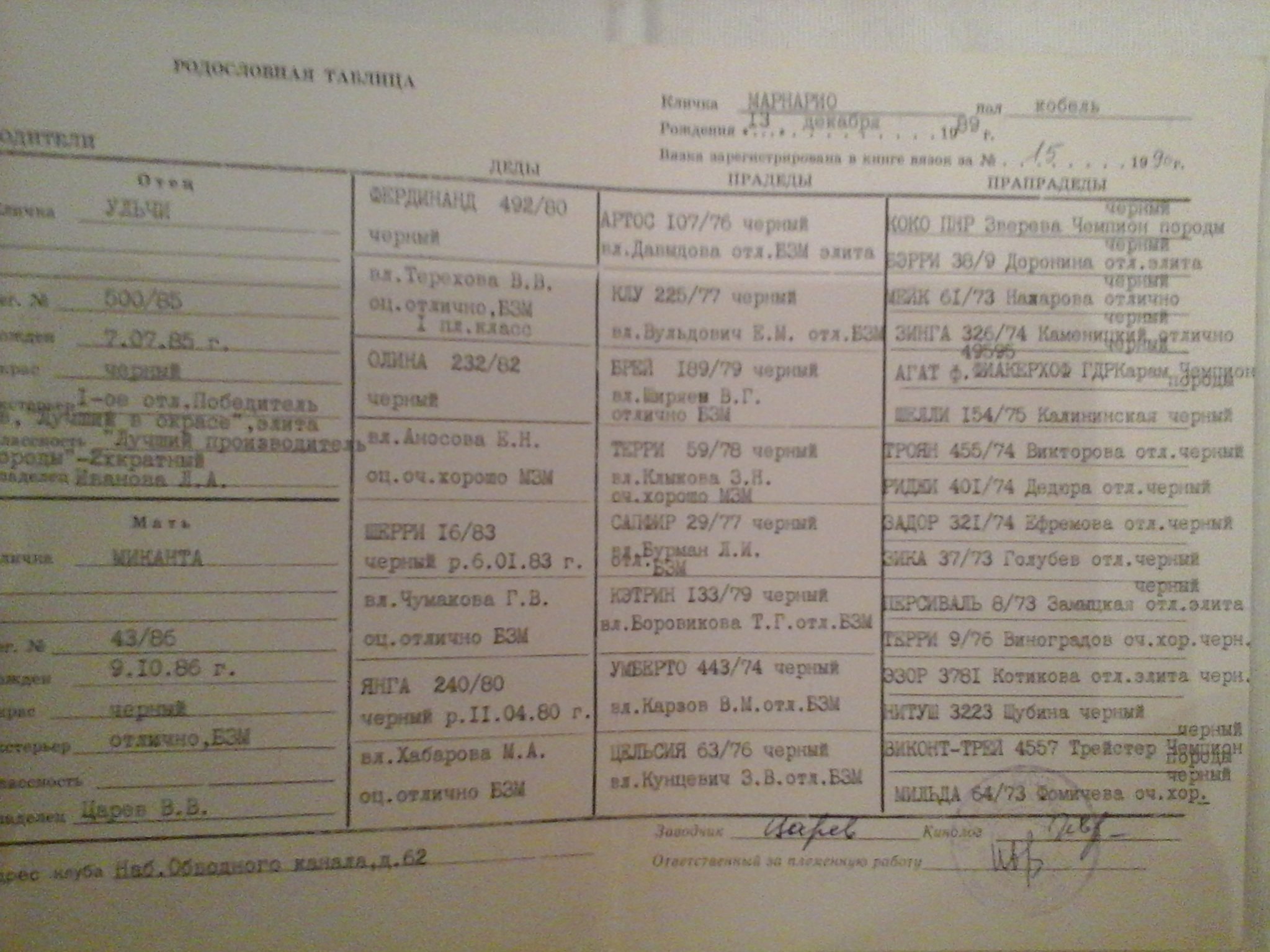 Сфотографировала родословную коричневого Марнарио 1989г.рожд. от моего черного Ульчи и черной Миканты, в родословной до 7 колена одни черные. В 4м колене есть Агат с правильным номером и правильным переводом клички на русский язык: