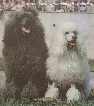 а я и не спорю, что ваша Дерика родилась в Уфе. Но, повторяю, ЕЕ РОДОСЛОВНАЯ - ОТЛИЧНЫЙ ПРИМЕР ГОРАЗДО БОЛЬШЕЙ СВОБОДЫ, КОТОРАЯ БЫЛА У РАЗВЕДЕНЦЕВ В ПОДОЛЬСКОМ КЛУБЕ. За этой свободой туда и приходили такие известные теперь разведенцы как Розенберг, Иванов, Ерусалимский... При случае, и мы использовали эти возможности, получали "совместные" пометы. В родословной Дерики два примера пар, которые ни за что не разрешили бы в МГОЛСе. 1 - ШЕР АМИ х Бен Оника Ника Рей. Шер Ами был малым пуделем. Отец из Чехословакии. Очень симпатичный пудель, но чем-то не пришелся по душе хозяевам и его по-просту выкинули. Пригрела беднягу Зина Кудрявцева (владелица ИЛЮСИИ Агаты). Так вот, вязку малого кобеля с большой пуделицей, причем в окрасе, где в производителях тогда нехватки не было - такую вязку можно было получить только через труп Ю.И.Шар (Председатель Племенной комиссии МГОЛС), но она была оччччень крепкая и горластая тетенька. И супер-эксперт! Хоть и грубоватая в ринге. 2 - Вторая половина этой "экспериментальной" пары - сука сама происходит из помета, который тоже никак не мог родиться во МГОЛС. Её отец БЕНДЖАМЕН (Таллин) - красоты неописуемой, сложения божественного!!! НО - У НЕГО БЫЛА КОРИЧНЕВАЯ ПИГМЕНТАЦИЯ НОСА ВЕК И ГУБ, светло-желтые глаза и (кошмар для МГОЛСа!). отсутствовали некоторые премоляры. Но были в Подольском клубе эксперименты и покруче. Так например, в 1983 году родился помет от серого ВАН-МИЛОРДа (Синикаева) и коричневой ЛАВ-ЭЛЬМы (Бобков). Все щенки были черными, один "темно-коричневый". Удачно выставлялась в Подольске и там же дала потомство одна сука из этого помета - ДОННА МАРИЯ НАЙТА, которая с возрастом стала "антрацитовой" и, несмотря на отличный экстерьер, не могла ни выставляться на выставках МГОЛС, ни вязаться по его племенным планам. А вот в Подольском клубе ее смогли использовать и в помете от серого БЕМИ-АМЕТИСТА (это был наш, мголсовский кобель) она дала белых, черных и серых потомков. С одним из этих серых я вязала потом свою Зильберту Зюку. ИРБИС АГАТ из Зюкиного помета был использован в разведении больших серых Галиной Савиной уже в СПК. Итак, пора дать иллюстрации к сказанному. На фото ИЛЮСИЯ АГАТА и ее "приемыш" ШЕР АМИ. Битца - 1984 год. _______________________________________