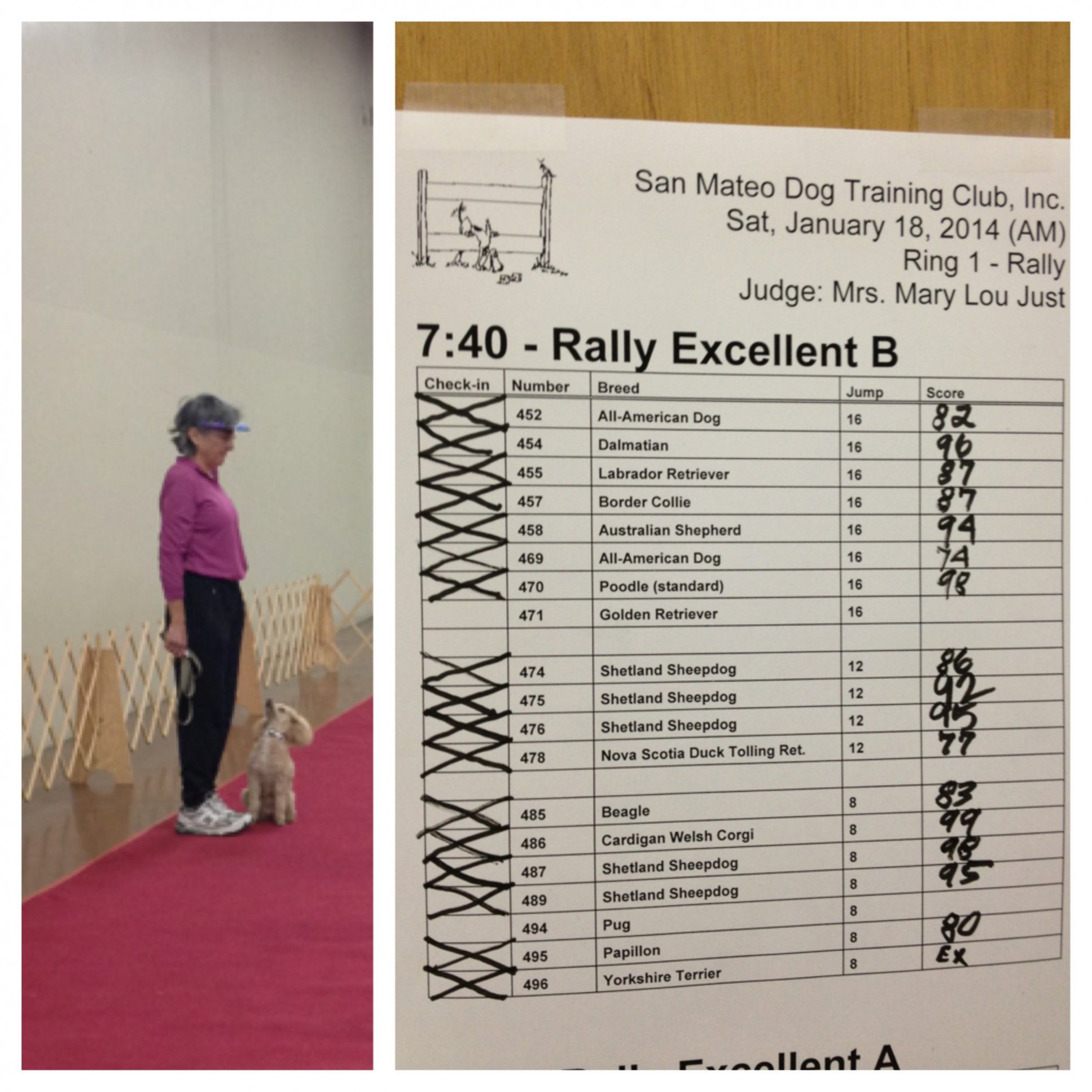 Нам обеим достались классы начинающих, Олесе Novice, мне Beginner Novice. Это самые весёлые классы: выступления короткие, а выступающие самые разношёрстные и разномастные, как хозяева, так и собаки. К более продвинутым классам всё становится куда однообразнее и скучнее. В этот раз удалось увидеть двух собак редких пород: муди и датскую овчарку. Про муди я уже писала, к сожалению фото не получилось. А датская овчарка нас сразила наповал: здоровый такой немец, без современных перегибов с анатомией, и тигрового окраса. Ошейничек на нём тоже был тигровый (фото 2). Ещё был один пули. На фоне этой собаки уход за пуделем в папильотках покажется детским лепетом... А пуделей было мало, к сожалению. На всё мероприятие только трое. Вот такая кроха выступала в моём ринге (фото 3). Очень собранно работала, но к сожалению, они не прошли квалификацию — собака вскочила с выдержки. Зато порадовал большой пудель, выступавший в самом продвинутом классе ралли, Excellent B — получил второе место в хорошей конкуренции. _______________________________________