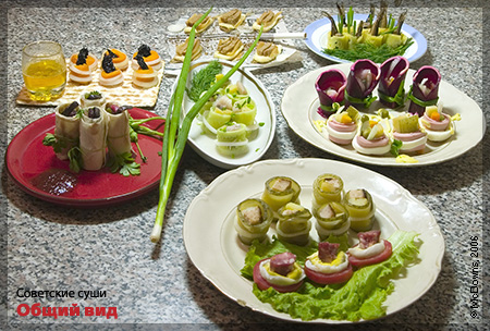 Далее, конечно же, два рецепта, без которых (в несколько иной форме) не обходится ни одно советское застолье. Конечно же, это «Оливье» и «Селедка под шубой». Думается, что всем прекрасно известны рецепты этих блюд, и потому каждый с легкостью приготовит эти суши по своему вкусу (например, мы не добавляли в селедку свежее яблоко, а многие считают это немыслимым). Обратите внимание, в этих двух рецептах используется майонез, хотя мы не слишком одобряем этот французский соус.