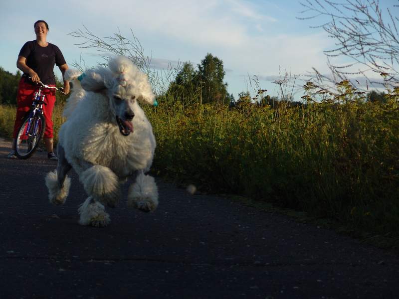 Ну, что ты, не надо подарков, лучший подарок заводчику- это образцово выращенный щенок, каковым Тришка и является! Обожаю вас всех, такие владельцы ПОДАРОК для любого заводчика! А зубки новенькие красивенькие! И старенькие Тришкины тоже неплохие! ![]() А мы только что вернулись с катания на велосипеде, собаки такие счастливые!!! Я раньше не решалась брать их ссобой, если я одна, боялась, что уронят А сегодня вспомнила, что когда-то давно купила в одном немецком магазине для собак чуднеький пояс, к которому можно прицепить поводок. Сам пояс одевается как обычный пояс и руки свободны от собачей упряжки! Сначала свора немного тянула. В безопасном месте я немного показала им как это неприятно, когда на тебя наезжает велосипед... Они посмотрели и поняли, что надо бежать только слева и мы совершили чудную поездочку! За часик я "укатала" их так, как за 2часа гуляния по лесу.